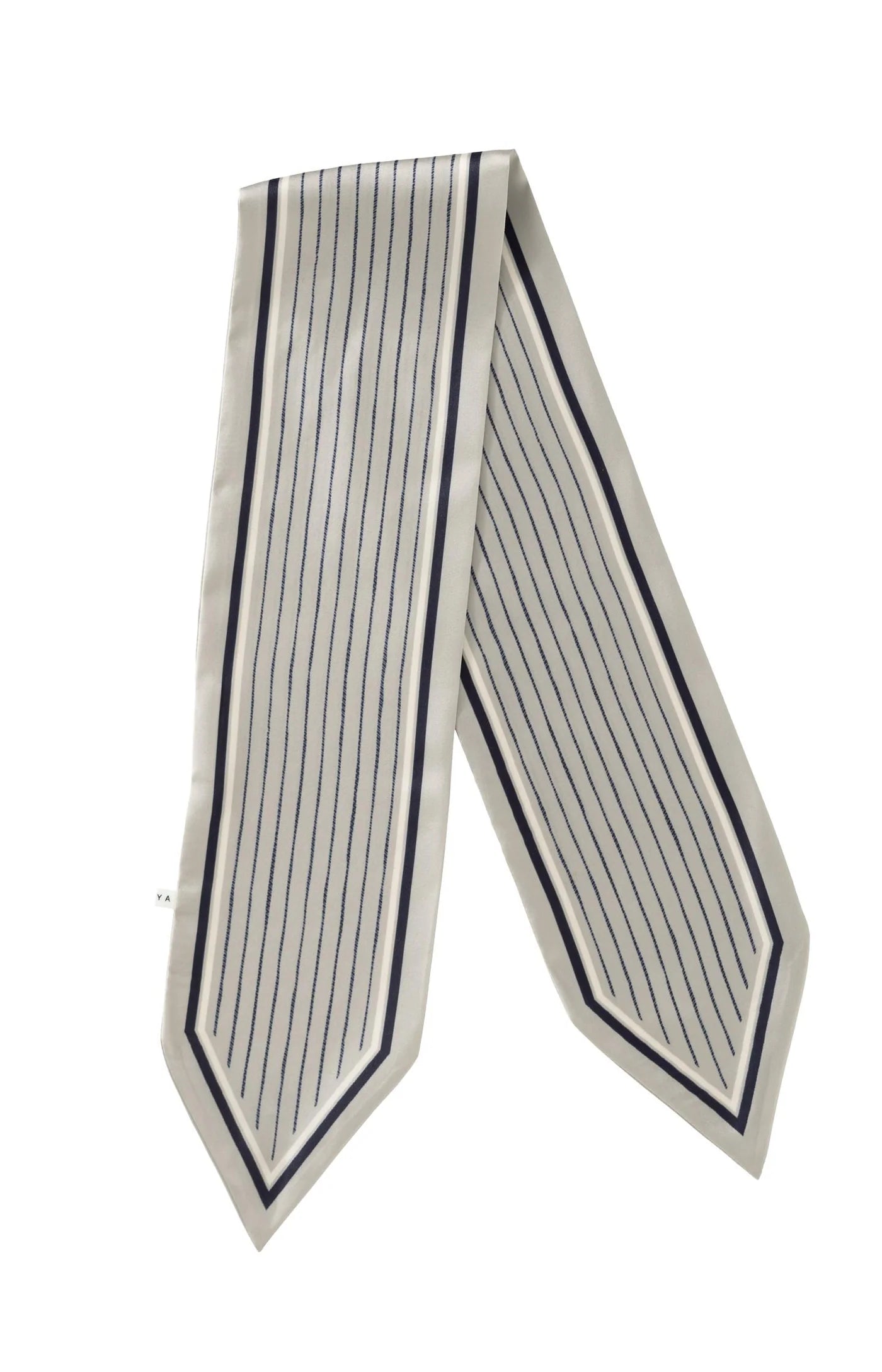 This elegant scarf is made from a fluid fabric with a subtle glossy finish. It features fine white stripes on a deep navy background, framed by a contrasting border. The narrow, elongated shape makes it easy to wear around the neck, in your hair, or tied to a bag. Lightweight and versatile.