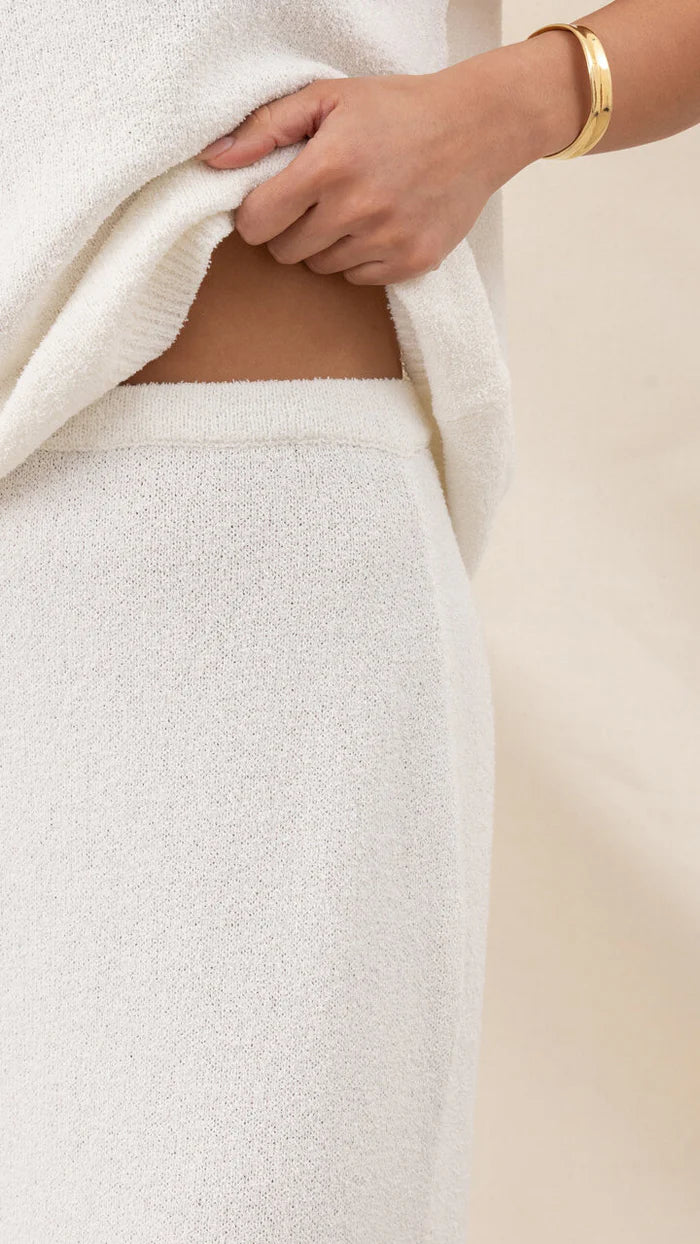The textured cotton bouclé knit offers a touch of subtle sophistication, while the elasticated waistband ensures a perfect, all-day fit. Designed with a practical back split for ease of movement, this skirt combines style and comfort beautifully.