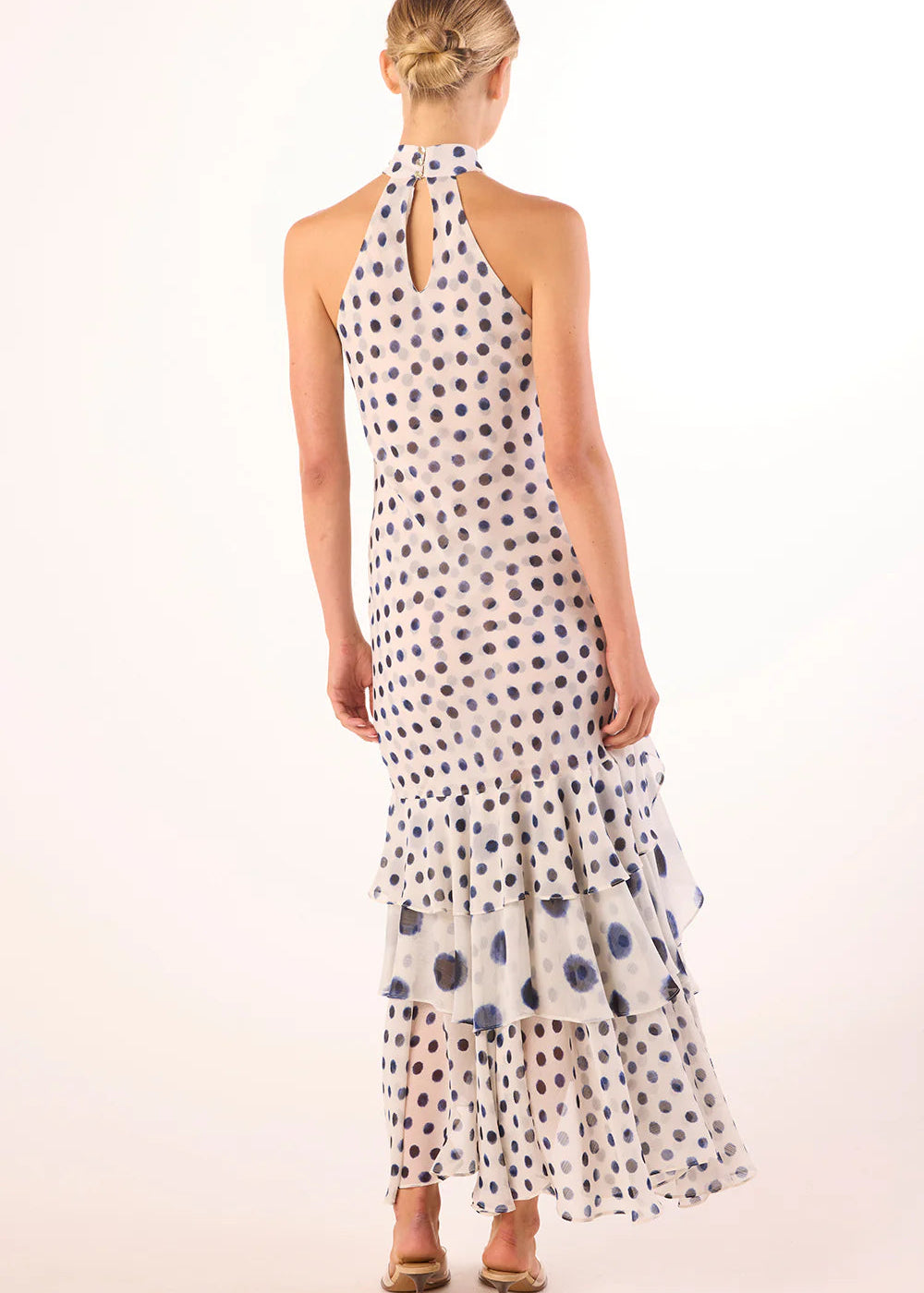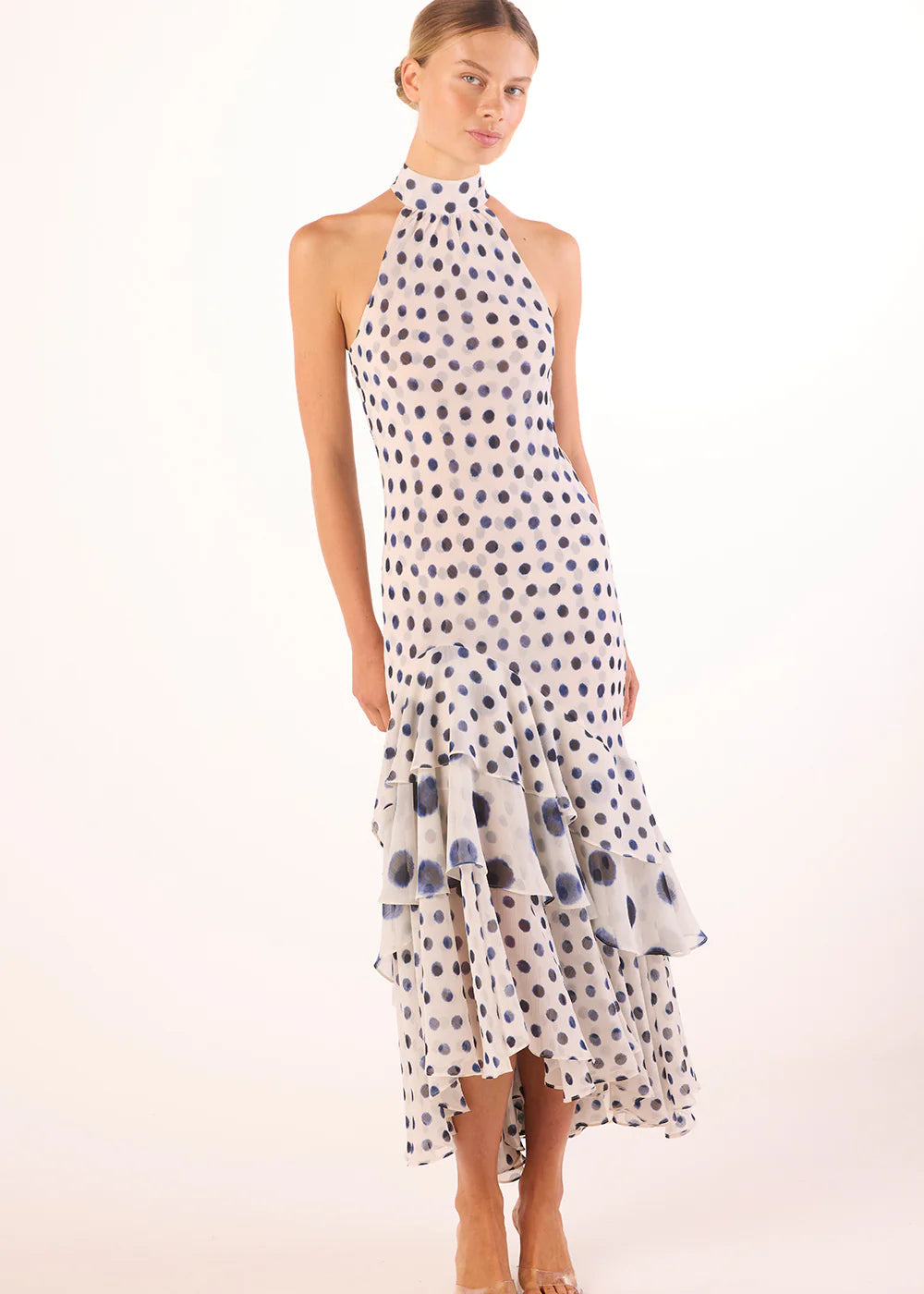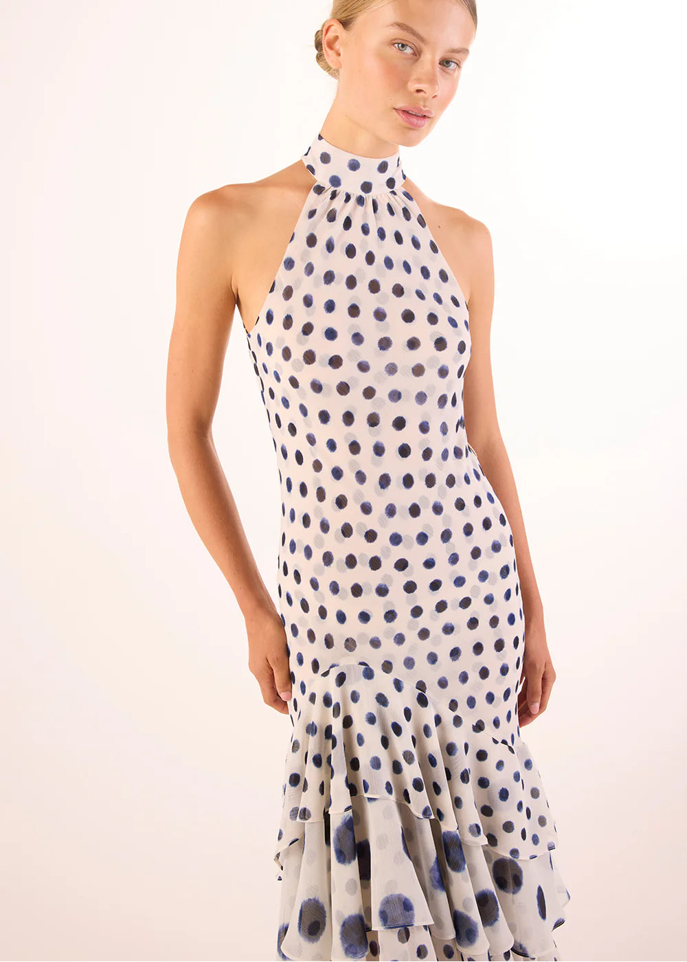 The Eliana dress returns for spring in navy polka dot–printed chiffon on a white ground. The main silhouette features a small-scale polka dot, contrasted with large-scale polka dot ruffle detailing for dimension. Designed with a sleeveless halter neckline and back-button keyhole closure, this flattering high-low midi is finished with a tiered ruffle hem and an optional self-tie belt to define the waist. A slipover style for effortless wear, it pairs beautifully with heels and a clutch for your next event.