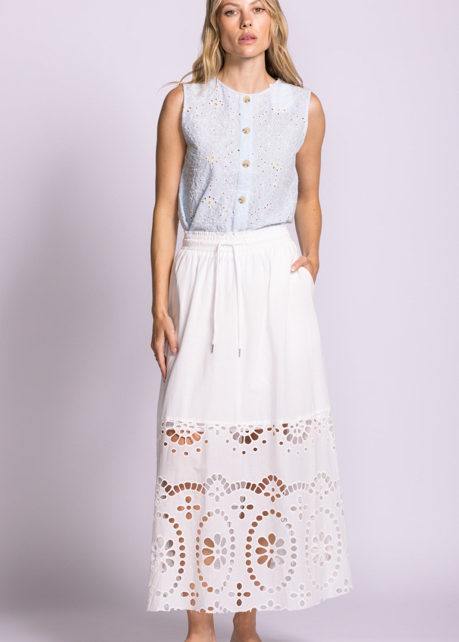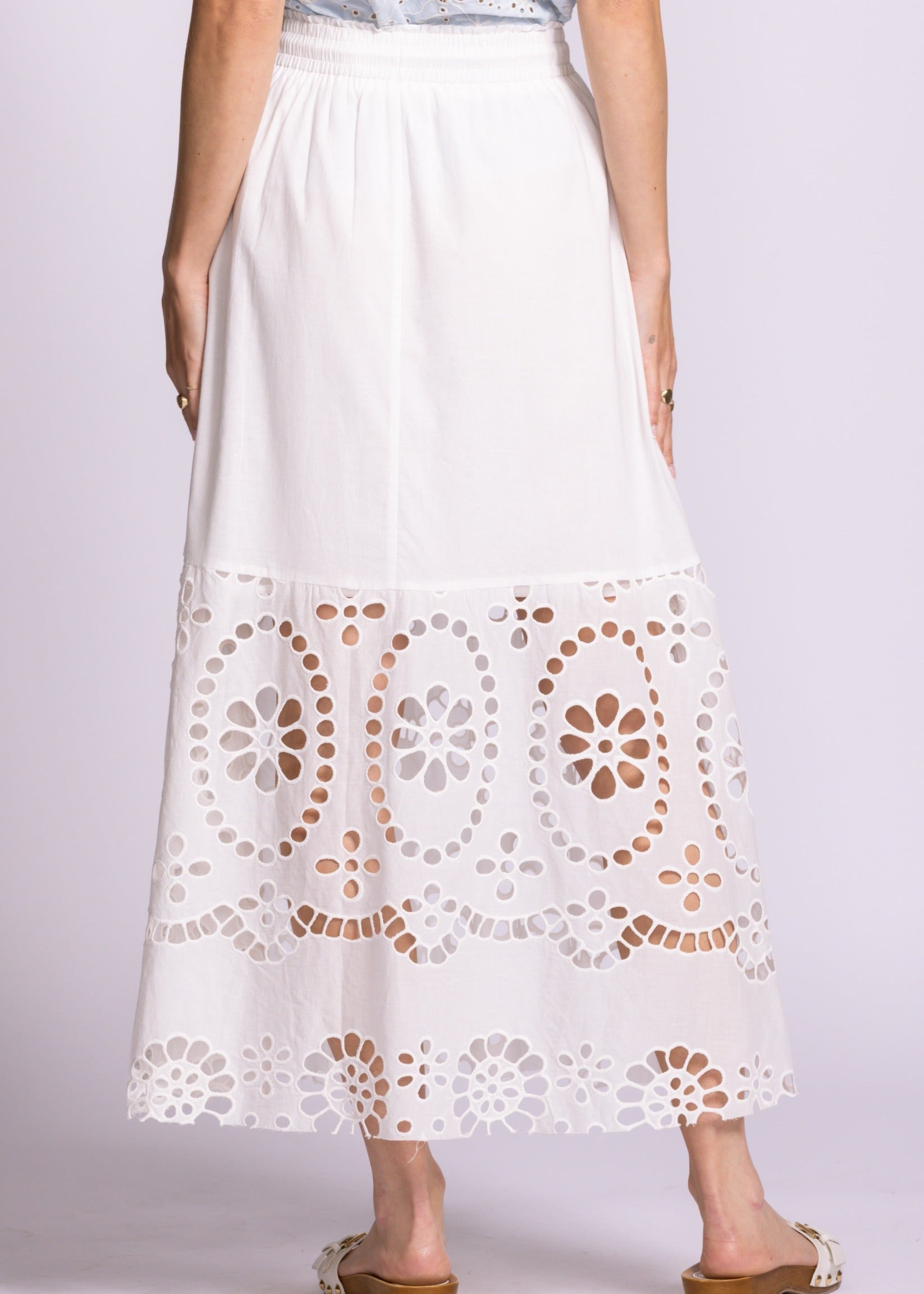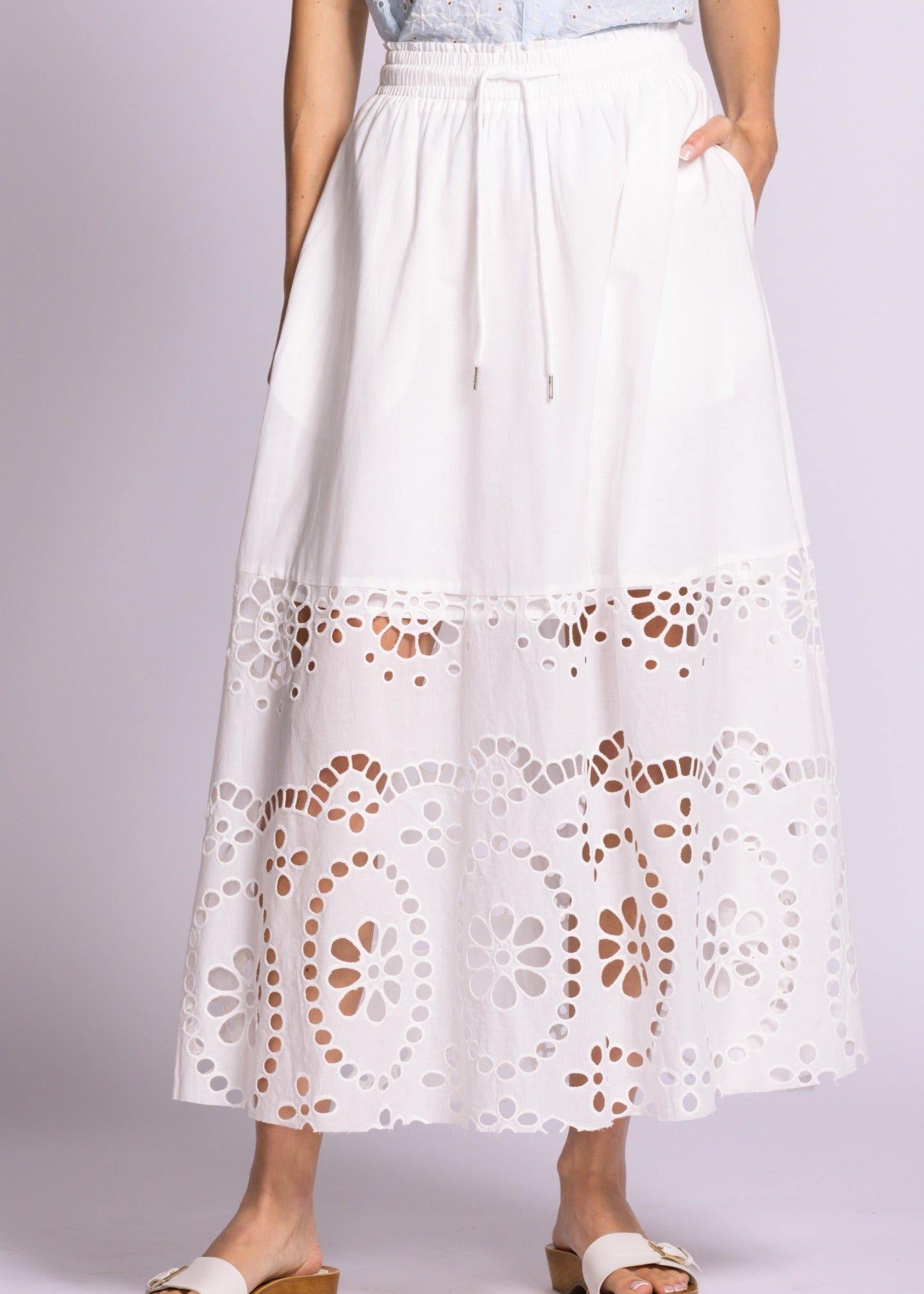 The Jolene Skirt features a classic A-line silhouette with an elastic waist and adjustable tie for a comfortable, customizable fit. Crafted from 100% cotton and fully lined, this piece offers breathability and ease of movement. Strategic eyelet cutouts add a modern edge to this versatile wardrobe essential. Perfect for layering or wearing solo, the Jolene transitions effortlessly from day to night.