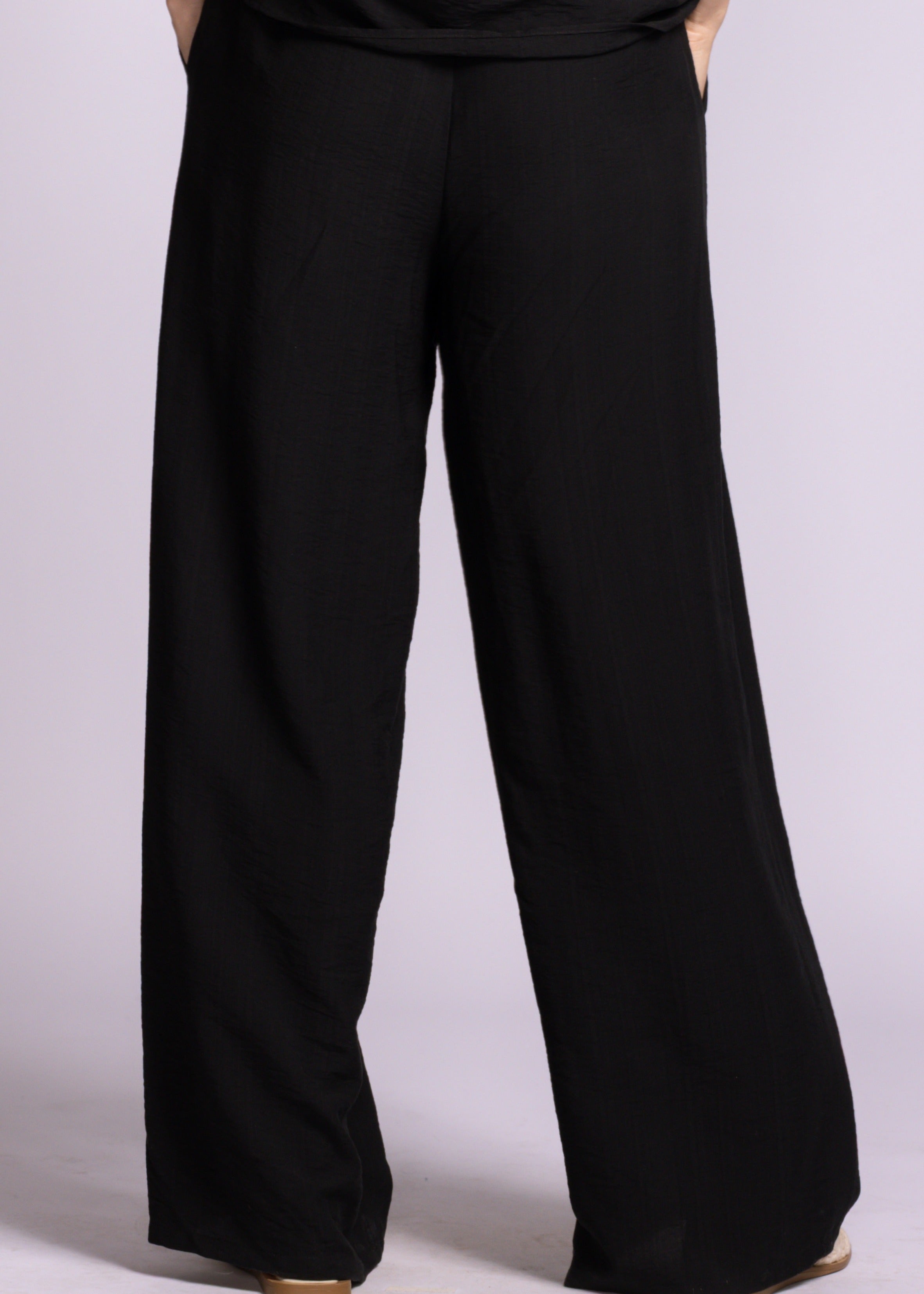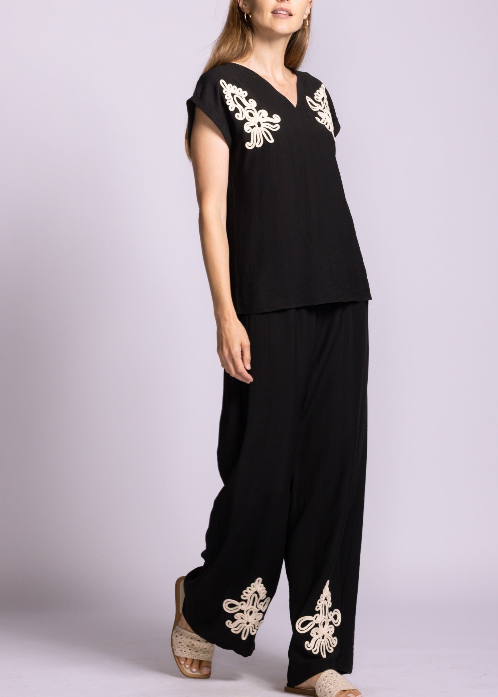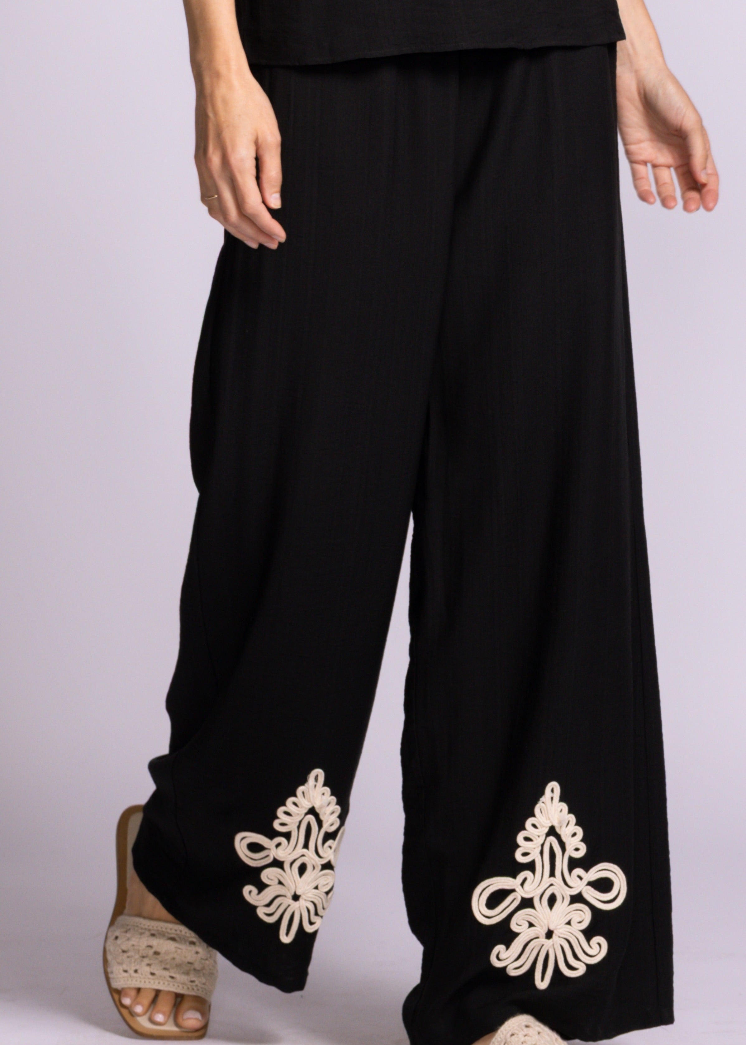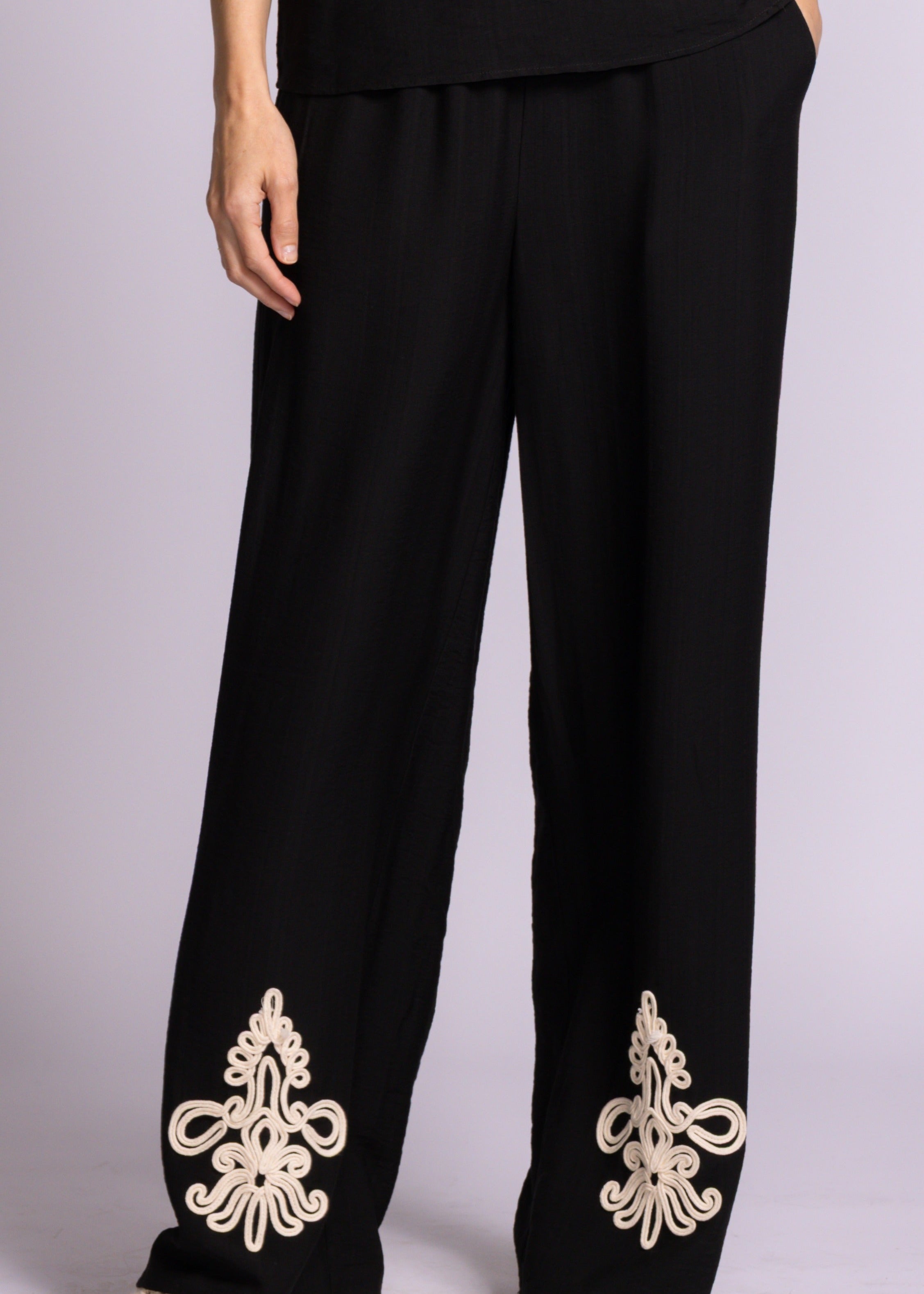 Effortless elegance meets comfort in the Otsego Pant. Crafted from a luxurious viscose and nylon blend, these wide-leg trousers feature a pull-on elastic waist for all-day ease. Delicate embroidery adorns the base of each pant leg, adding a refined finishing touch. Perfect for transitional dressing, from office to evening.