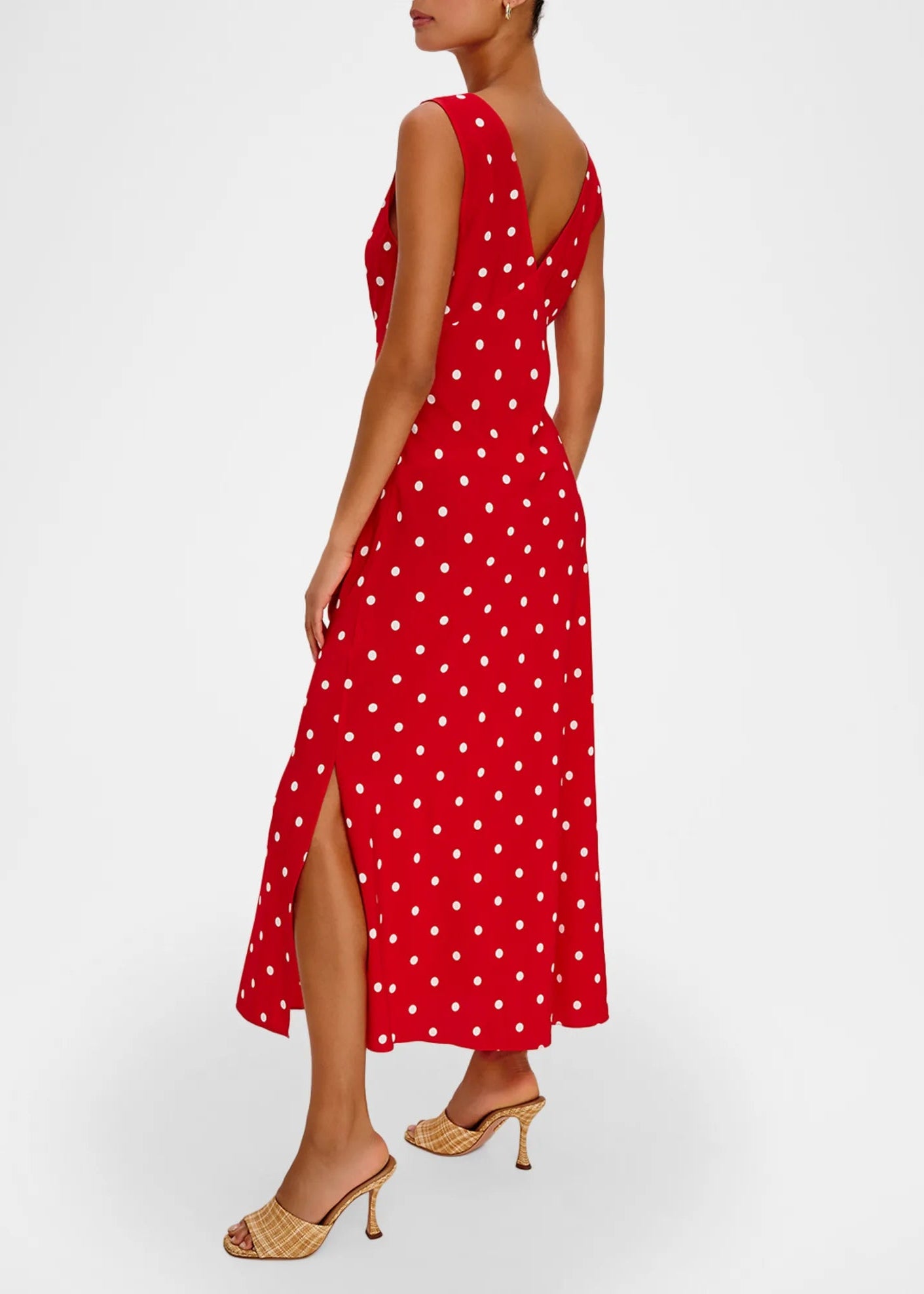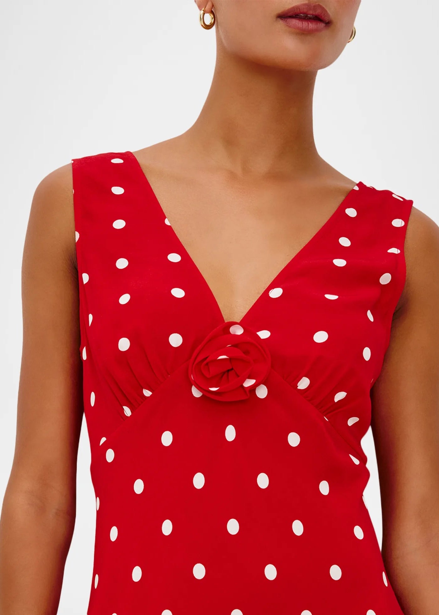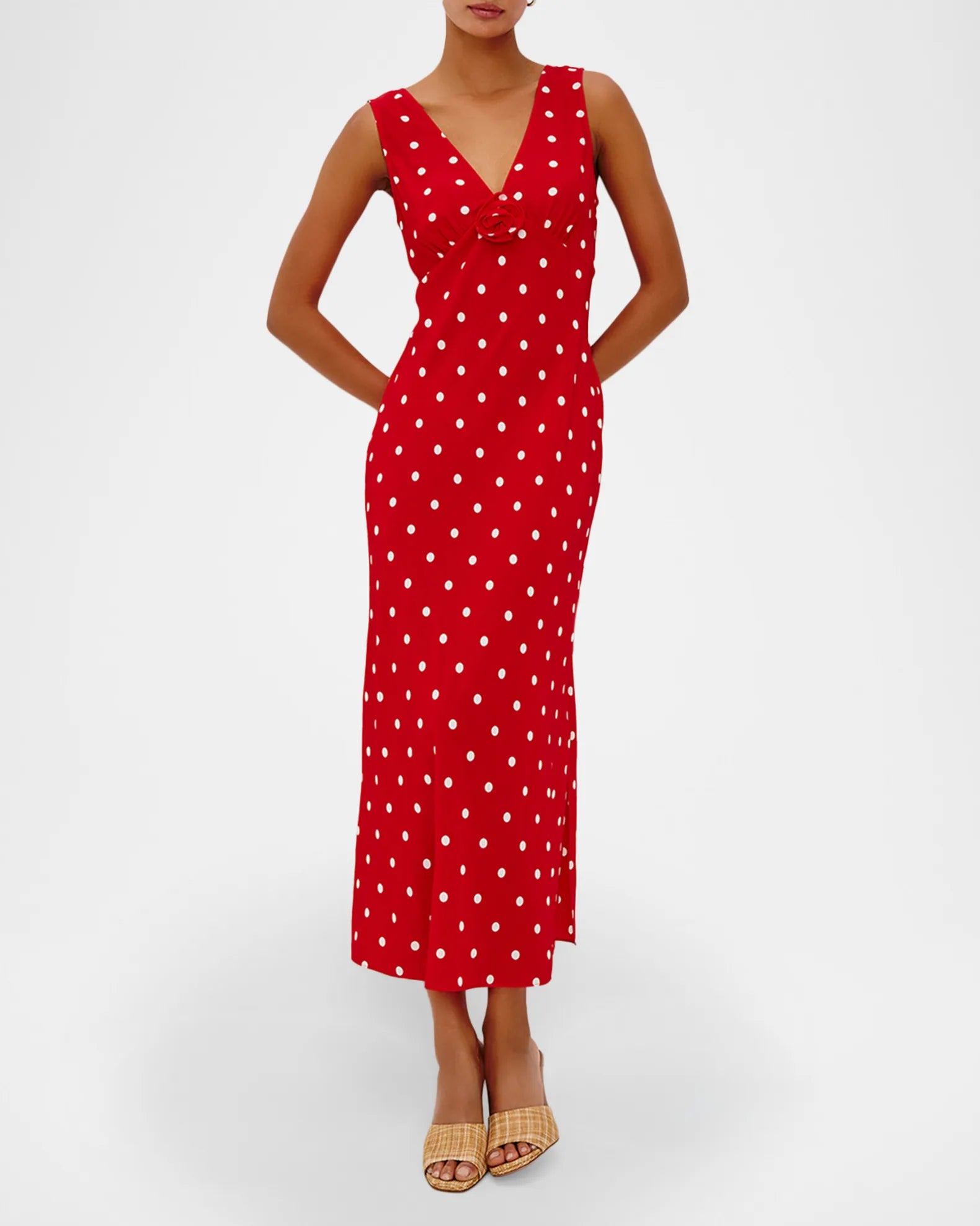 Elevate your wardrobe with the Terena Dress from the Giadzy x Rails Collection. This striking slip dress features a contrast polka dot print adorned with an eye-catching 3D rose detail that adds dimension and sophistication. The flattering V neckline and sleeveless cut create an elegant silhouette, while the slip design drapes beautifully to a knee-length hem. An invisible side zip ensures a seamless finish. Crafted from luxurious viscose for a fluid, comfortable feel. Imported. Dry clean recommended.